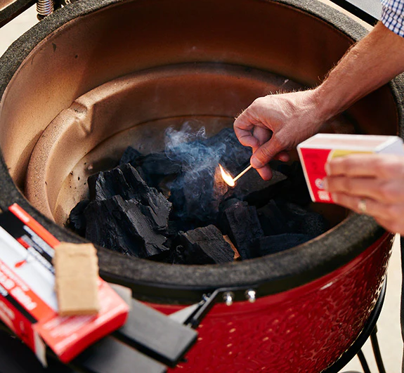 Lighting a Kamado grill is very easy. Load the grill with the food’s required amount of charcoal, then use a couple of natural fire lighters, and leave the lid and all vents open.